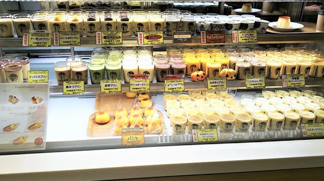 その日に展開しているプリンは店頭にそろっています。目移りしてしまいますが、まずここでプリンを選びます。もちろんテイクアウトも承ります。