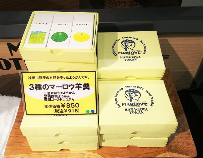 マーロウは神奈川県産の材料を使ったギフトに最適なようかんも作っています。これは「三浦かぼちゃようかん」「足柄抹茶ようかん」「湘南ゴールドようかん」のセット918円(税込み)。県外の方へのお土産に持っていったらすごく喜ばれそうですね。