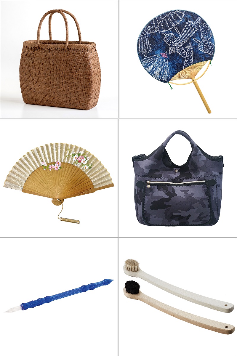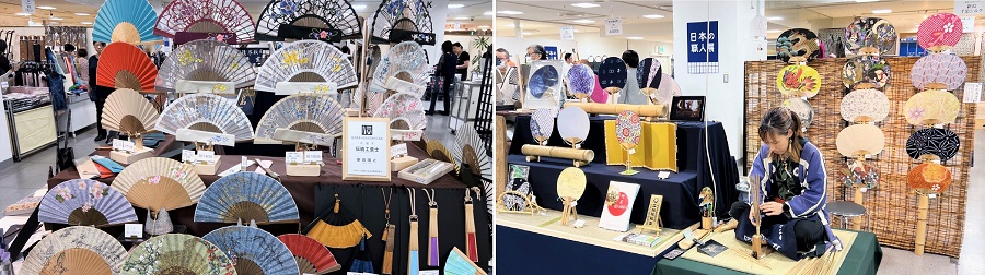 左は京都 紗月扇の扇子、右は千葉 竹星の房州うちわ。夏のイベントなどの際、人とはかぶらない個性ある装いには欠かせないアイテムですね。
