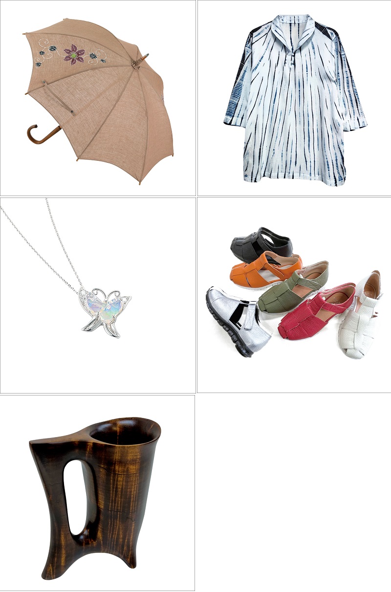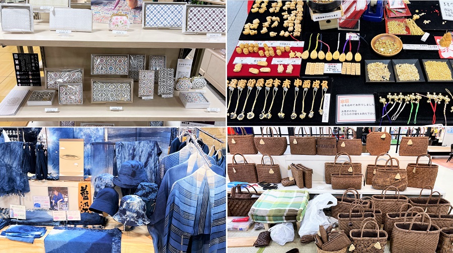 左上から時計回りに、職人が作る色々なこだわりのお洒落グッズ。東京 シルクハウスの浅草文庫レザー財布、東京 匠の会ひねもすの縁起名前札、山形 つる工房鷹山の山ぶどう蔓バッグ、群馬 中田屋の藍染絞りです。