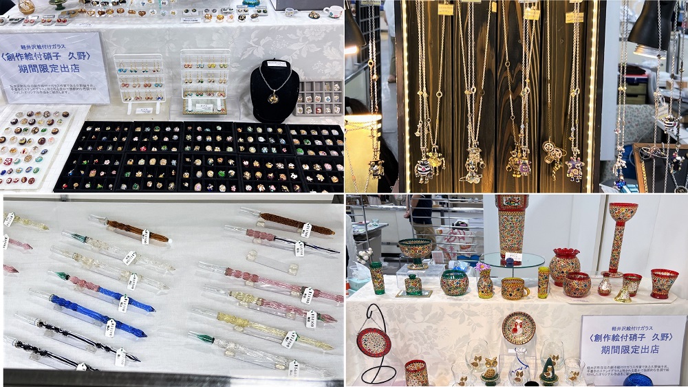 左上から時計回りに、長野 創作絵付ガラス 久野の創作絵付ガラスのペンダントチャーム、神奈川 ラグデザインワークスのロボットアクセサリー、長野 創作絵付ガラス 久野の創作絵付ガラスのオブジェ。東京 佐瀬工業所のガラスペン。いずれも日本人ならではの繊細な手仕事による高い完成度で引き込まれそうな魅力です。