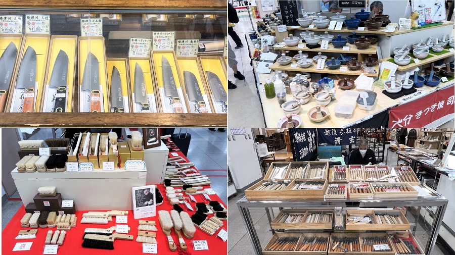 左上から時計回りに、職人が作る色々な道具類。京都 義定刃物の京刃物、大分 杵築焼司窯のごますり、新潟 河清刃物工業の越後与板打刃物、東京 宇野刷毛ブラシ製作所の向島手植えブラシです。いずれもそれぞれの道のプロ御用達の道具ですが、本物の道具は使い心地と耐久力が違います。