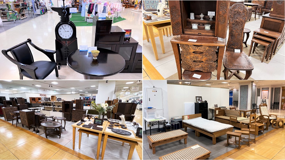 左上から時計回りに、職人が作る色々な木工家具。福岡 星野民藝の民芸家具、長野 一彫堂の軽井沢彫家具、福島 かねはちの会津桐工芸、鹿児島 九州銘木の屋久杉木工です。本物の木のぬくもりに日本の職人ならではの高度な技が掛け合わされた、何世代も使える味わい深い家具類です。