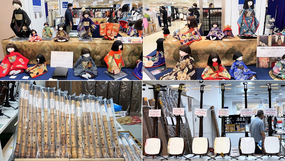 上段は奈良 工房朋の市松人形。ここでは別誂えオーダー人形やお持ちのお人形の修理も承っています。次いで下段は埼玉 那須邦楽器の三味線と尺八。琴も展開しています。こういった日本の伝統文化工芸は今や国内よりも海外から注目が高まっています。