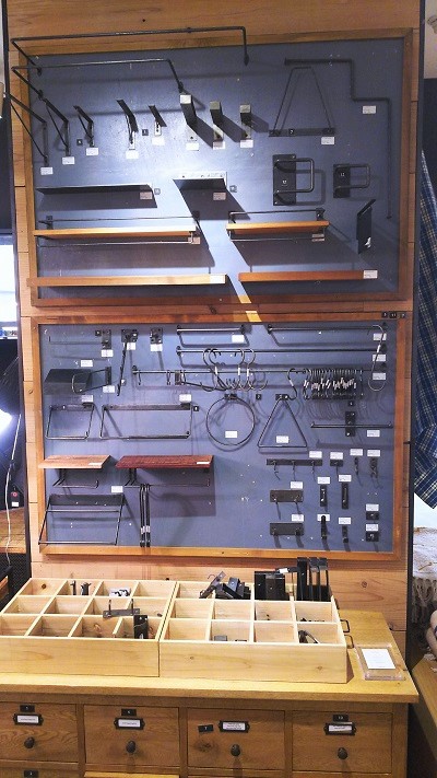 左)カスタムパーツ;ブラケット・軸受け、壁かけシェルフ、タオルバー・ハンガー掛け、ペーパーホルダー、フック・金具、スイッチプレートなど小さいながらも機能面・空間デザイン面で大きな役割を果たしてくれるアイテムたち。 素材の良さを出し切ったアイアンなど独特な質感を前面に用いたパーツやサブパーツたちは、 空間の質を何倍にも高めてくれます。ここにはそんな「名脇役」たちがそろっています。