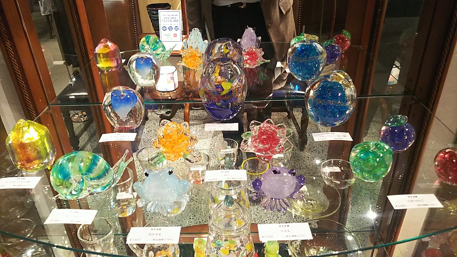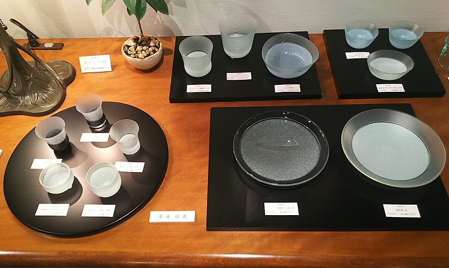 こちら2点は緒方氏の工房「アトリエB.O.O.」の作品です。緒方氏の作品同様ガラスの華やかさや柄、シルエットがつくりだす雰囲気を感じることができます。