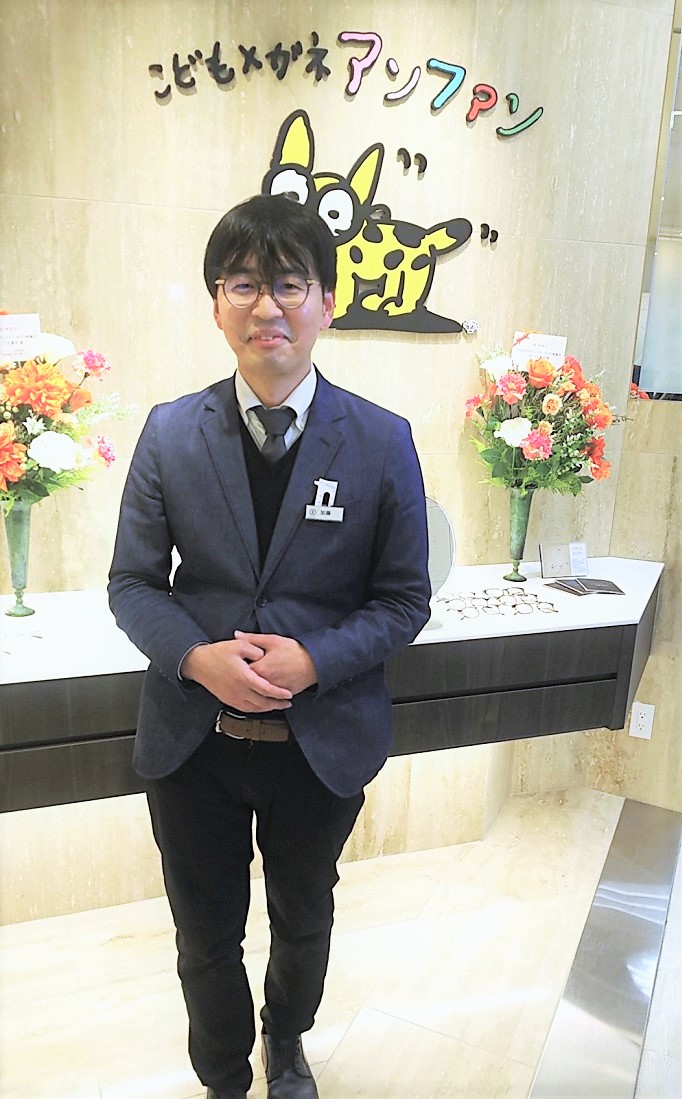 加藤店長はこどもメガネ アンファン小田急百貨店新宿店の店長を7年間担当。2021年11月のそごう千葉店への出店にともない千葉店に着任いたしました。お子さまが楽しく喜んでメガネを掛けてくれる時が何よりも嬉しいそうです。親御さまに対しても、心配事や不安がある方には、これまでの経験や専門知識をもとに情報を提供して、少しでも安心してもらえるように心がけています。お子さまがメガネをかけることに前向きな気持ちになっていただけることが何よりと考えています。自身も一児のパパとのこと。お客さまと一緒に、お子さまの健やかな成長を願って、誠実な対応を心がけております。他店でお買い上げいただいたメガネの調整やクリーニングも承っておりますので、是非お気軽にお越しください。