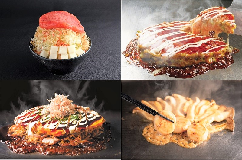 左上)自家製明太子もちもんじゃ 右上)チーズの明太ミルフィーユ焼き 左下)豚たっぷりモダン焼き 右下)ホタテとエリンギのオイスターマヨ焼き