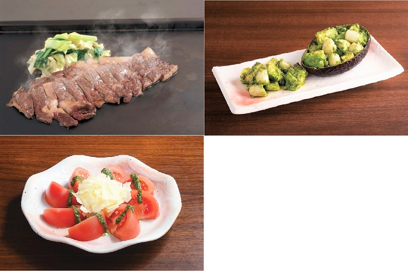 左上)北海道産士幌(しほろ)黒牛リブロースステーキ 右上)アボカドと貝柱のWASABIバジル 左下)北海道パルメザンチーズのまるごとバジルトマト