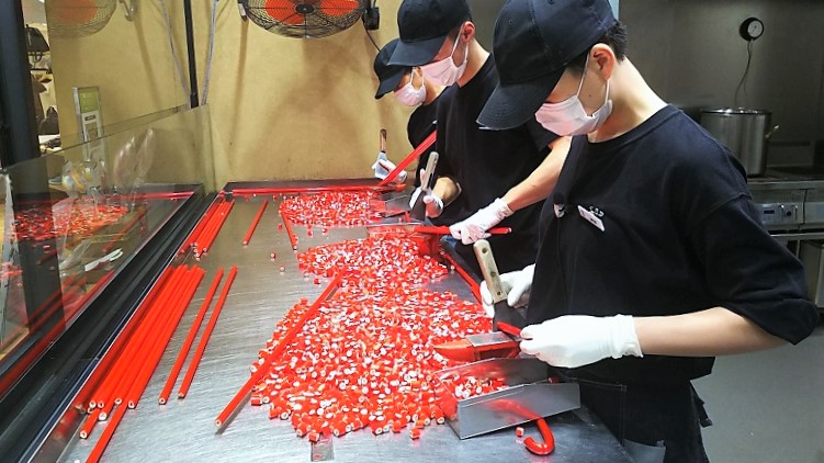 森本店長はパパブブレの千葉ジュンヌ出店以来この店を守っています。160℃に達する15㎏の重さの飴を冷ましながら、繊細な柄が断面に出てくる太い飴の棒を作り、一気に引き伸ばし細かくカットしていくという、力仕事と繊細さの両方が求められる作業であり、一通りのラインアップが作れるようになるまでに2~3年はかかるそうです。さらにオーダーメードでお客さまのお名前を入れたキャンディを作るなど、手の込んだ仕事ができるようになるには一層の修行が必要とのこと。店長以外のスタッフたちも毎日お客さまの前でパフォーマンスを見せながら作業に取り組んでいます。