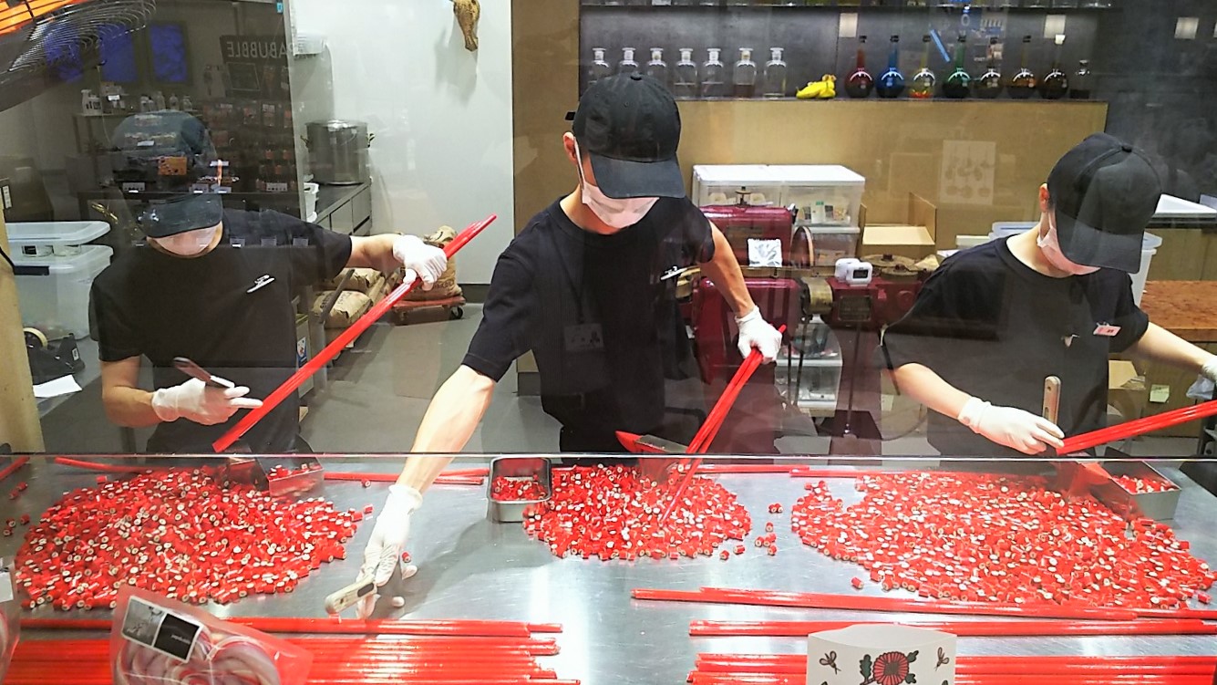 森本店長はパパブブレの千葉ジュンヌ出店以来この店を守っています。160℃に達する15㎏の重さの飴を冷ましながら、繊細な柄が断面に出てくる太い飴の棒を作り、一気に引き伸ばし細かくカットしていくという、力仕事と繊細さの両方が求められる作業であり、一通りのラインアップが作れるようになるまでに2~3年はかかるそうです。さらにオーダーメードでお客さまのお名前を入れたキャンディを作るなど、手の込んだ仕事ができるようになるには一層の修行が必要とのこと。店長以外のスタッフたちも毎日お客さまの前でパフォーマンスを見せながら作業に取り組んでいます。