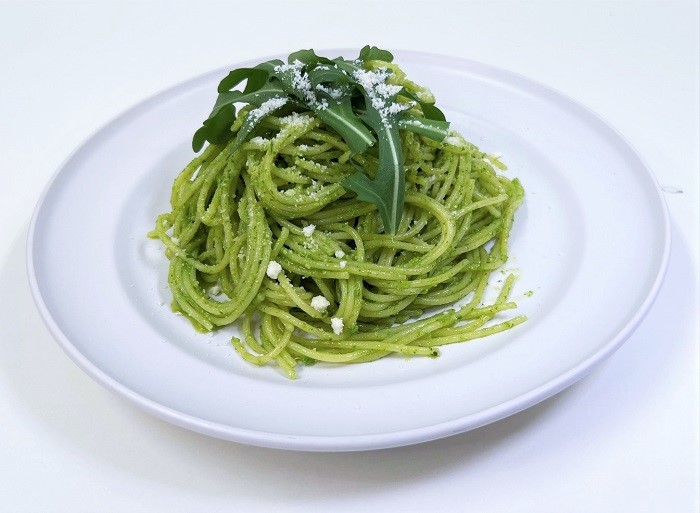 ジェノベーゼスパゲッティはすっかりおなじみのメニューで、独特のバジルの香りが人気ですね。簡単に作るには市販のバジルペーストもあります。本格的に作るときは松の実を入れたりもしますね。でも今回はどちらかというとサラダや肉料理の付け合わせによく使われるイタリア野菜のルッコラでジェノベーゼ風スパゲッティを作ってみます。ルッコラはゴマのような香りと独特なピリッとした辛みが特徴で最近はよくご家庭でも使われますから、少し余ったりすることもありますね。管理栄養士の末広彩織の提案するレシピでは2人前50gという一袋の半分くらいのルッコラと、これまた最近のローカーボ(低糖質)フード志向で間食用にご家庭によく登場するカシューナッツをミキサーにかけてジェノベーゼ風ソースを作ります。たっぷりと入れるオリーブオイルとにんにくの香りとも相まって、しっかりした青みの春らしいスパゲッティに仕上がります。これは新しいメニューになりそうです。【2022.4月記】