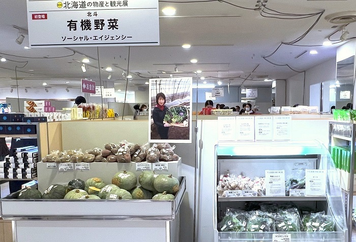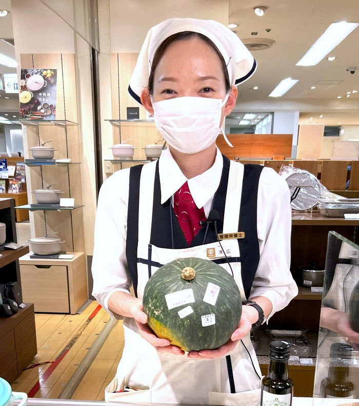 今回、食品フロアスタッフの末広彩織は、7階催事場で開催された「北海道の物産と観光展」に登場した有機野菜販売コーナーの北斗ソーシャル・エイジェンシーの有機野菜くりりんかぼちゃを使った「かぼちゃのミルクスープ」をご提案します。秋の味覚のひとつであるかぼちゃは素材の甘さを活かしたレシピがおすすめ。かぼちゃとミルクを使ったやさしい味わいのミルクスープは、かぼちゃのほんのりとした甘さが楽しめます。しっかり炒めたたまねぎとベーコンが深いコクをだしてくれるので、シンプルな調理方法で素材の良さが引き出されます。今回は「北海道の物産と観光展」の会場となった7階催事場の向かい側の「おいしいヘルシーキッチンスタジオ」で撮影を行い、お客さまにもご試食いただきました。この季節ならではの味わいにぜひ挑戦してみてください【23.10月記】