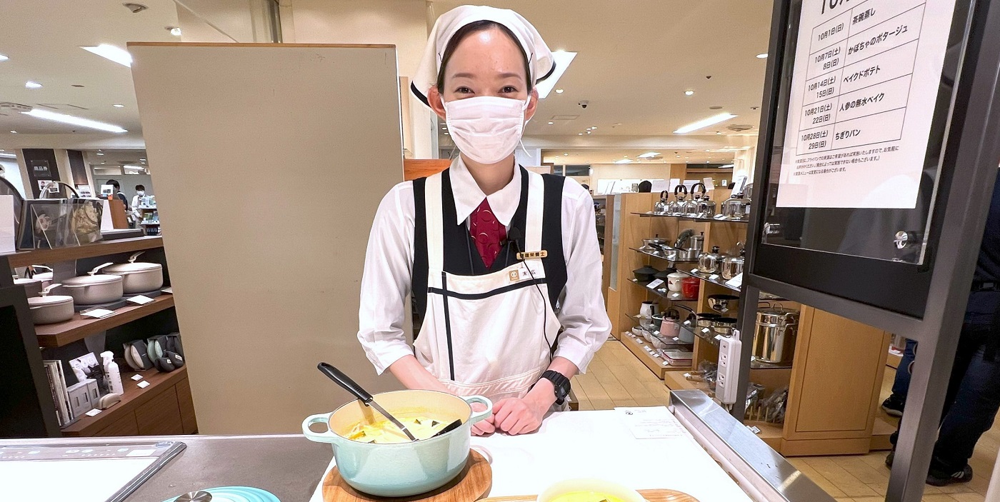 今回、食品フロアスタッフの末広彩織は、7階催事場で開催された「北海道の物産と観光展」に登場した有機野菜販売コーナーの北斗ソーシャル・エイジェンシーの有機野菜くりりんかぼちゃを使った「かぼちゃのミルクスープ」をご提案します。秋の味覚のひとつであるかぼちゃは素材の甘さを活かしたレシピがおすすめ。かぼちゃとミルクを使ったやさしい味わいのミルクスープは、かぼちゃのほんのりとした甘さが楽しめます。しっかり炒めたたまねぎとベーコンが深いコクをだしてくれるので、シンプルな調理方法で素材の良さが引き出されます。今回は「北海道の物産と観光展」の会場となった7階催事場の向かい側の「おいしいヘルシーキッチンスタジオ」で撮影を行い、お客さまにもご試食いただきました。この季節ならではの味わいにぜひ挑戦してみてください【23.10月記】