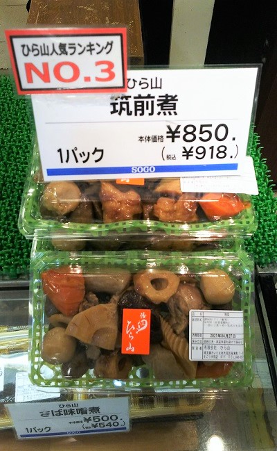 ひら山の「う巻」や「筑前煮」など、開店以来そごう大宮店定番の人気商品もあります。う巻は関西の出汁巻き玉子焼・う巻より少し甘めの寿司ネタ玉子焼などのような関東風。筑前煮はごぼう、竹の子、椎茸、こんにゃく、竹輪、人参などあらゆる具材にしっかりと味が染み込むまで柔らかく煮てありプロの技を感じられます。