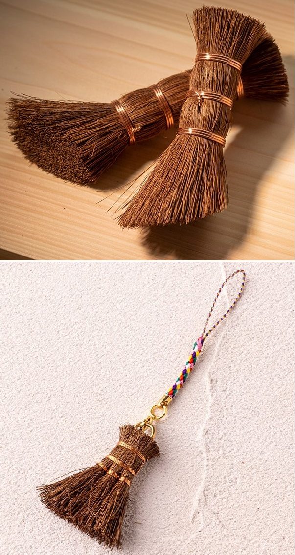 下)棕櫚の花言葉は「勝利」。お守りストラップ型ミニ箒