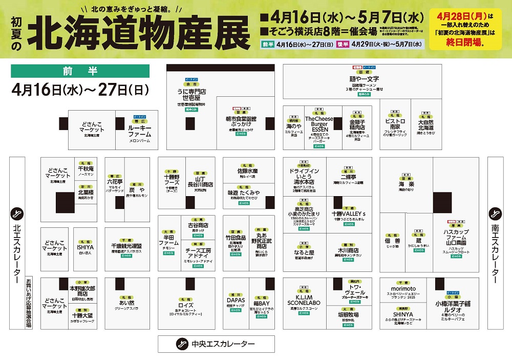※4月28日(月)は一部店舗入れ替えのため「初夏の北海道物産展」は終日閉場。 ※最終日は午後5時閉場。 ※イートインコーナーのラストオーダーは各日閉場の30分前まで。