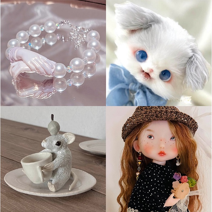 石塑粘土を使用し、童話のような世界観の動物オブジェやジオラマ作品、インテリア作品などを制作。