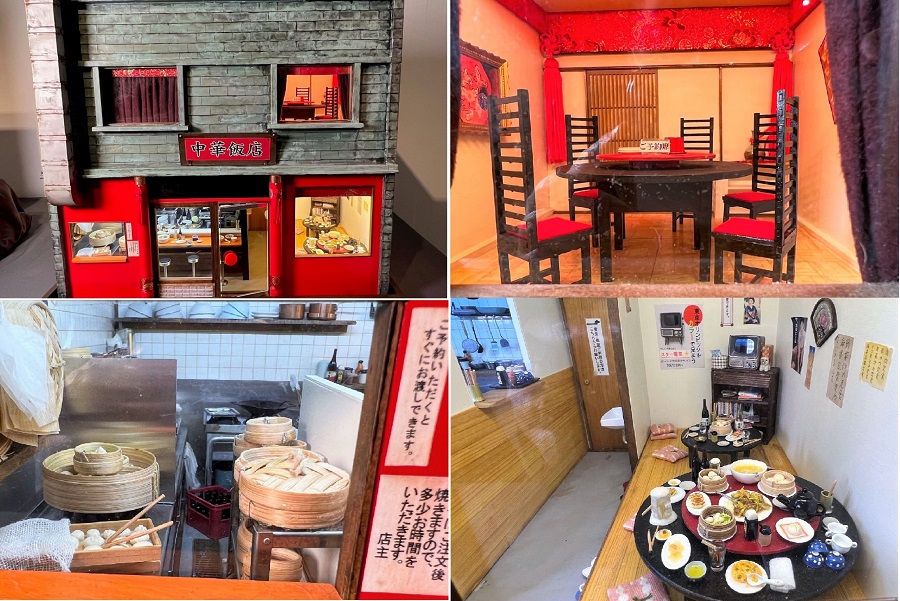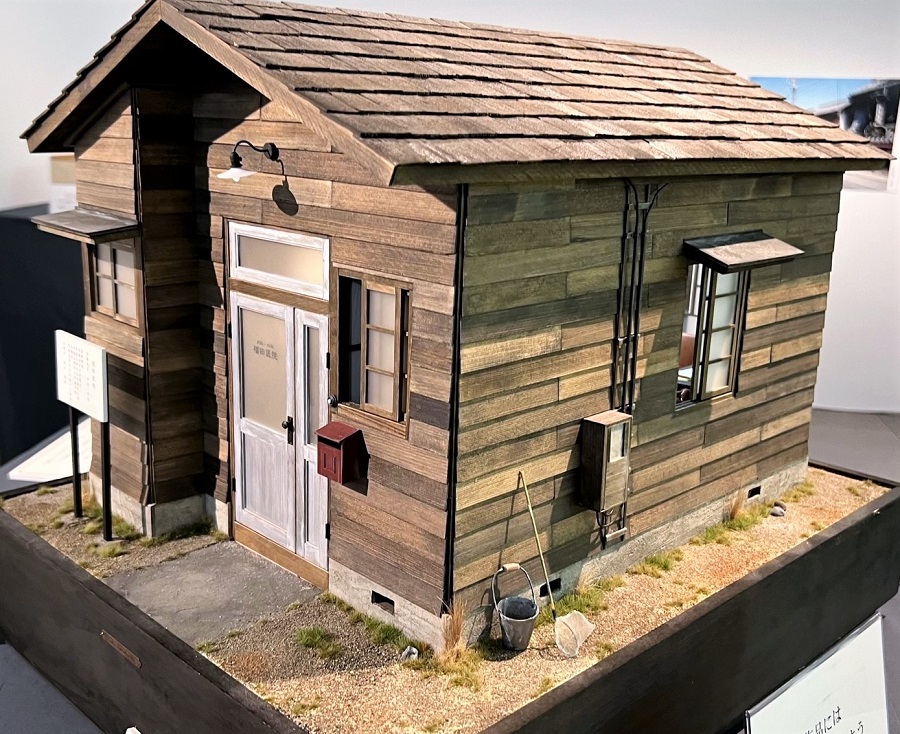 千葉県佐倉市の土蔵造りの古い町並み。ドールハウスになったこの建物の中では、昭和の時代に本屋さんと蕎麦屋さんが営業している姿を克明に描いています。正文堂書店は明治13年の建築で、書籍、文房具、切手などの販売を行っていましたが現在は中の店舗は別なものになっています。小堀屋蕎麦店は明治33年の建築で現在も営業中。昔のメニューが復刻された真っ黒な「黒切り蕎麦」が有名だそうです。