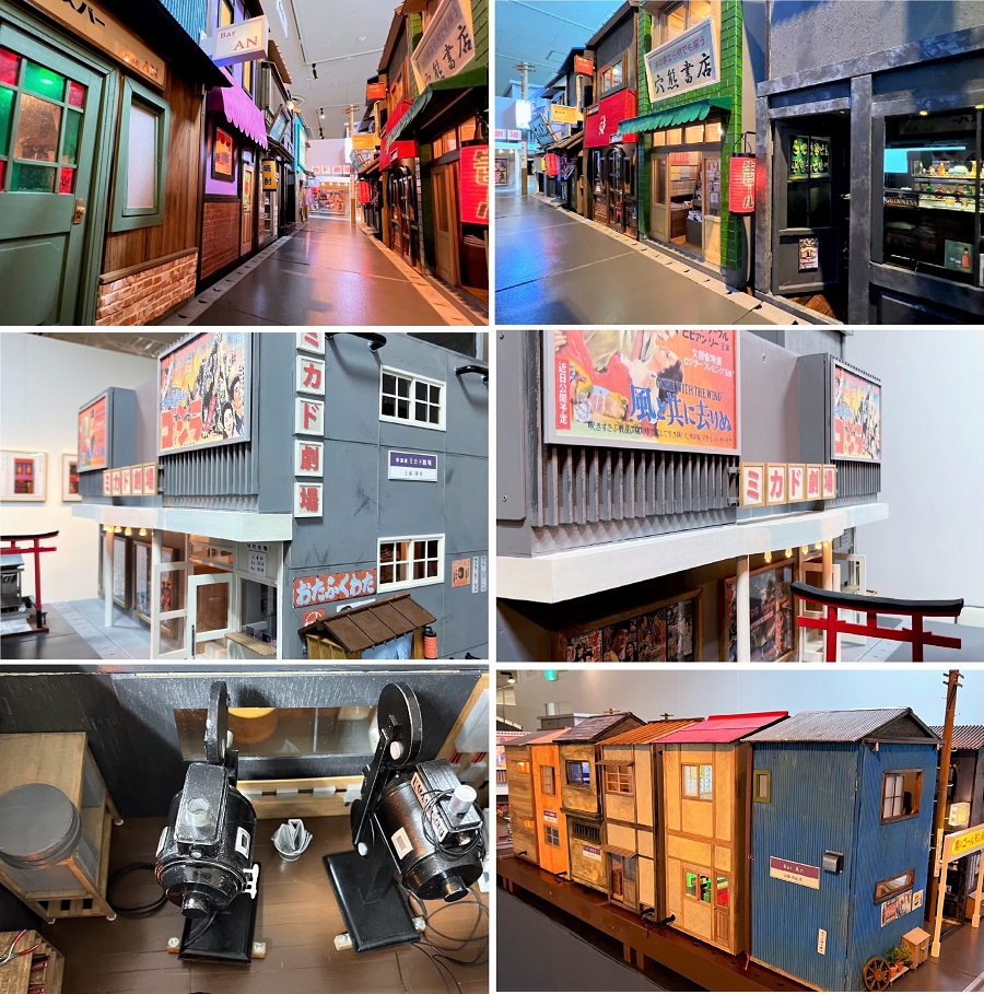 「男のゴールデン街」と銘打っていますが新宿に限らず日本全国どこにでもあった歓楽街、飲み屋横丁です。多くの店が木造二階建てです。当時のホーロー看板なども再現されています。路地の一番奥には映画館。上映映画のポスターは当時の上映映画の演目となっています。この映画館は当時と同じ2台の映写機まで再現されています。お稲荷さんや屋台や木製ゴミ箱なども再現されています。土屋氏のもとに9人の作家が集まって12棟の店舗が軒を連ねる商店街ができました。