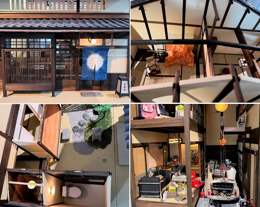京の町屋は狭い間口の奥に長い居住空間があります。手前の店舗区画を抜けると「おくどさん」のある厨房区画と居住空間とが分けられており、途中には坪庭があり、一番奥には蔵がありますが、トイレなどは昭和時代の洋式のものにリニューアルされていたりします。また別の町屋では伝統的な建物の中にチェーンブロックで自動車修理まで可能なフィアットなどこだわりの小型車が入るガレージがあったり、バウハウスの椅子が置いてあったりといった、良いものへのこだわりの強い京都人らしい昭和期の町屋も表現されています。