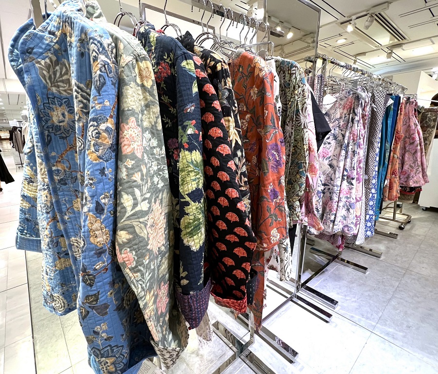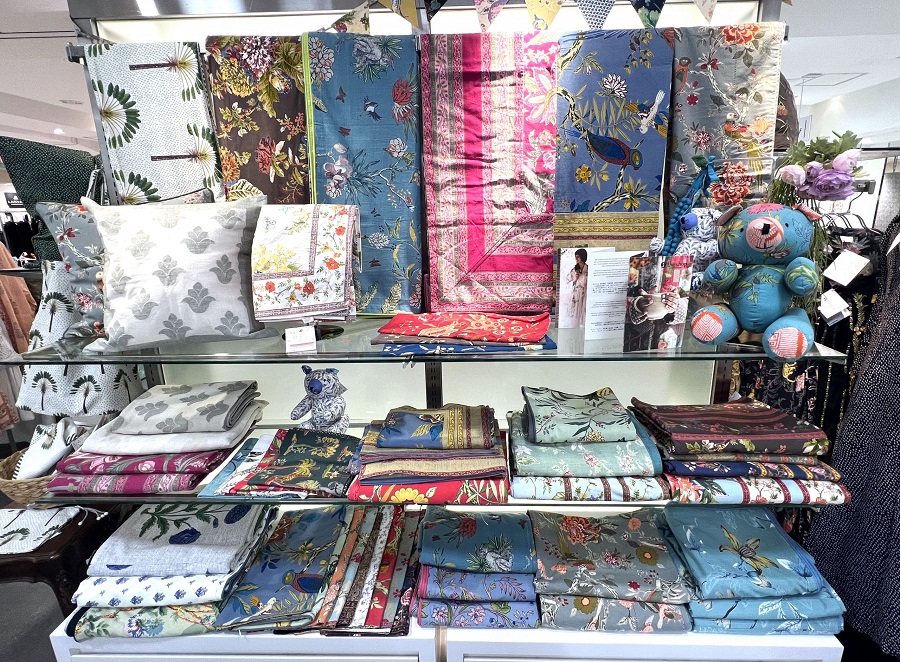 The Shop INDIAのPOP UP SHOPを担当する(株)ルーシーケイの野口さん。1969年インドの首都デリーで創業し、今も国内外で愛され続けているThe Shopの美しいテキスタイルデザインに魅せられた一人。創業以来、インドの伝統的な染色様式であるハンドブロックプリントのデザインをシルクスクリーンや刺繍で表現するさまざまな製品を展開するThe Shop INDIA。現代的なデザインと伝統工芸の熟練技を融合させたモノづくりが魅力的なインドのライフスタイルブランドです。職人の労働環境や地球環境を重視。また、端切れを使ったアップサイクルの製品も人気のアイテムになっています。