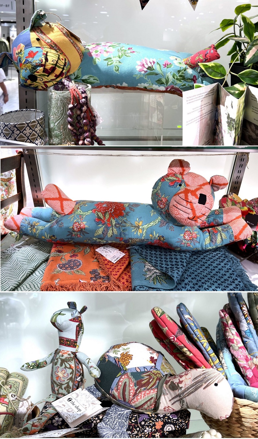 端切れを使ったアップサイクル商品の中でもユニークなのが動物の縫いぐるみです。インドの職人たちの手による、ちょっととぼけた表情が面白いトラやカメや牛や熊など動物たちの姿には癒やされます。
