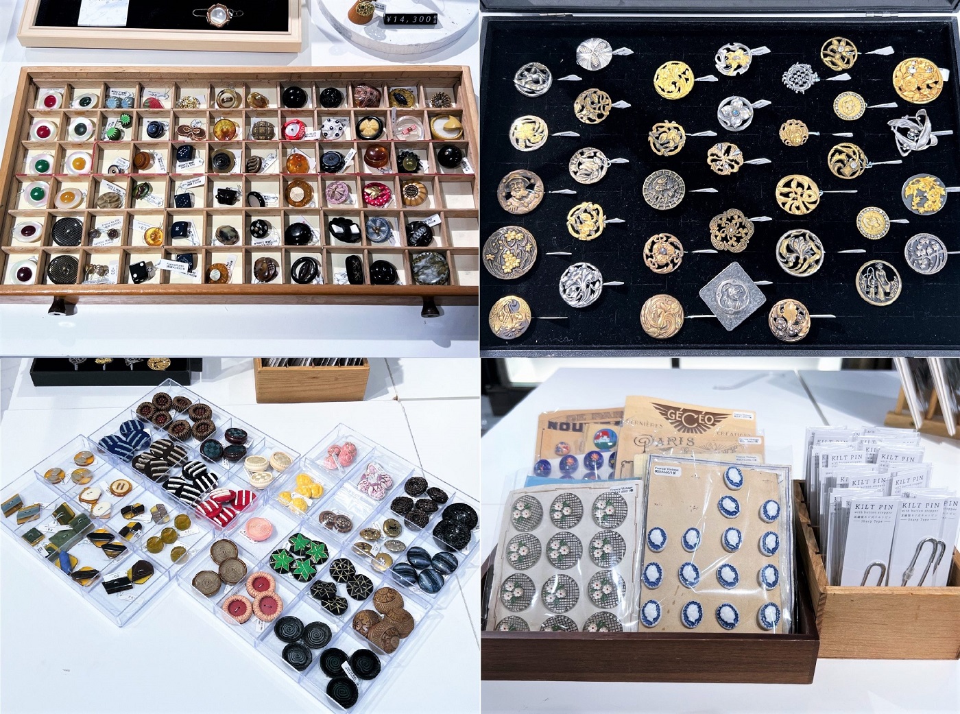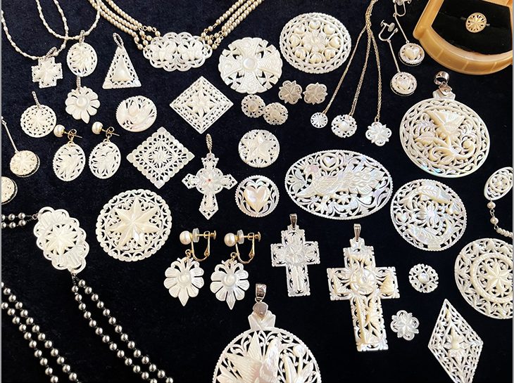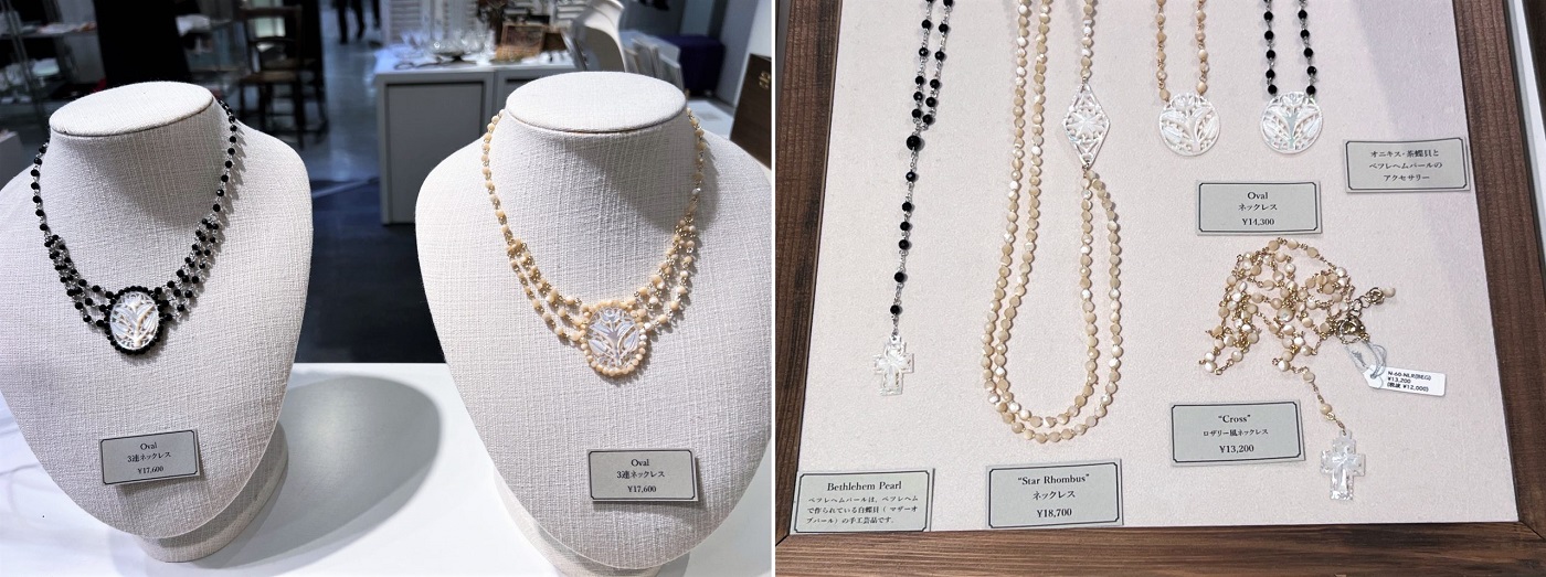 ベツレヘムの職人が一つひとつ手作りした貝細工を、東神田のアンティークボタン専門店が装身具に仕立てました。