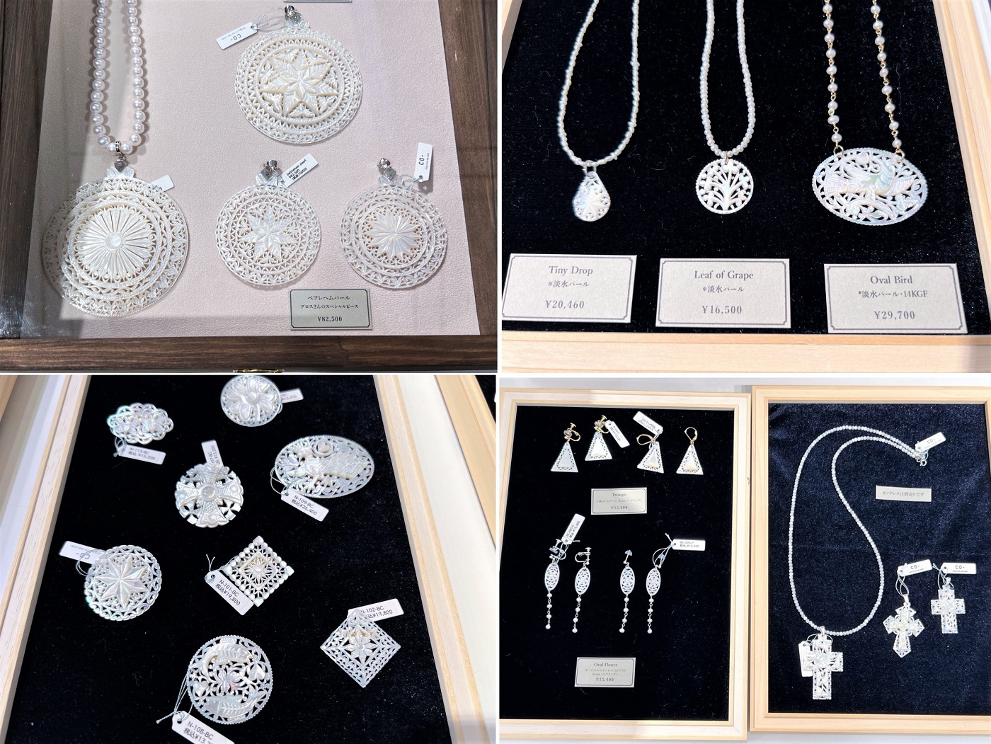 クロスやベツレヘムの星といったキリスト教のモチーフや、動物や花、幾何学模様をアレンジした大小さまざまなベツレヘムパールのアクセサリー。