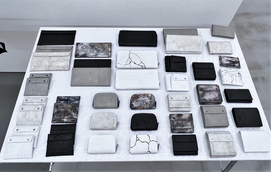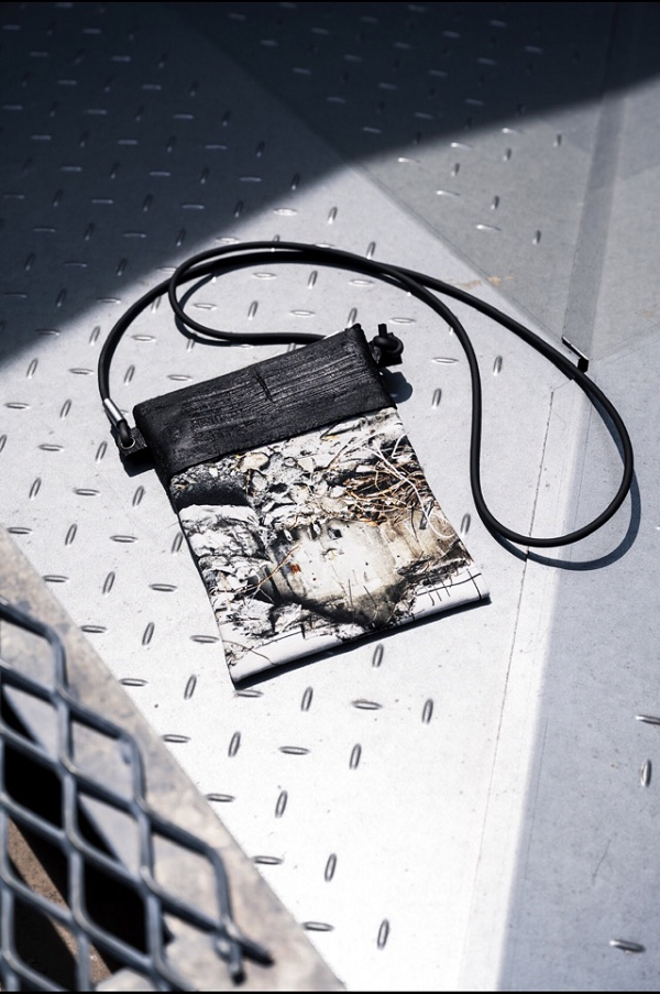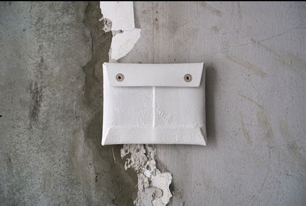 カガリユウスケは1984年生まれ。父は和紙作家の明松政二。2005年頃から壁の写真を撮り始め、同時期に壁の質感を再現したカバンを作り始めました。2012年10月より秋葉舞子氏に師事。秋葉氏のウェザリングに影響を受け作品を発表しています。主な作品としては革の上に建築材のパテを塗り、使用者が経年変化させる事で完成する「wall」。wallにウェザリング加工を施し、より壁の質感に近付けた「都市型迷彩」。革に激しいシワ加工を施した「skin」。カメラを用いて、街への視点をカバンにした「virtualwall」などがあります。【22年10月記】