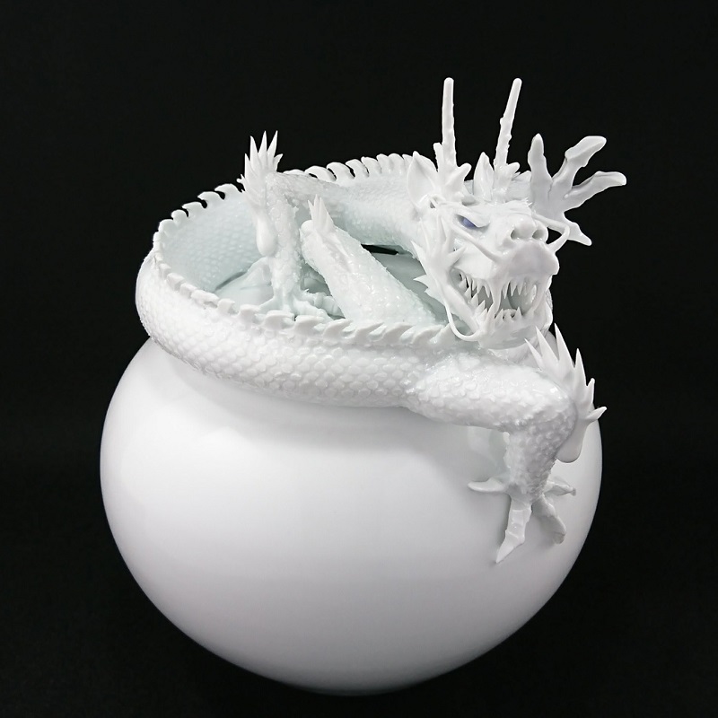 白龍は天上の神に仕えるとされ、五行説においては西方を守護する龍といわれています。宝玉は轆轤で成形され、躰の造形は捻り細工によって制作されています。手足、角、牙、爪、睫毛の一本一本まで、手のひらと指先を使って部位が作られ、置きあげ技術により数多くの鱗が表現されています。宝玉の成形、白龍の細工から1,300度の炎で焼きあげるまでの収縮を目算し、熟達した技と経験により創造された本作は、力強さと美を堪能できる渾身の逸品です。