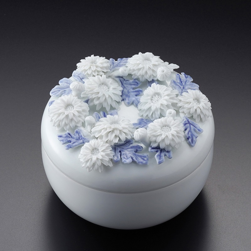 長寿を願う菊花を華やかに蓋に配置した白磁のボンボニエールです。菊花は菊細工といわれる捻り細工の技法の一つを駆使して制作。親指先ほどの粘土の塊から竹べらを用い花弁を一枚一枚起こして菊花を彫っていきます。慶事を祝う品として用いられる小さなお菓子を入れるための器です。