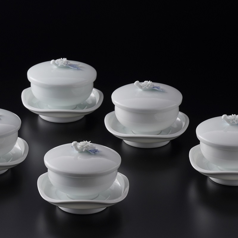 大切なお客さまへのおもてなしの蓋付煎茶碗です。長寿を願う菊花を蓋のツマミに用い、物事を安定させる形とされる四方押しの清らかな白磁の茶托と合わせました。