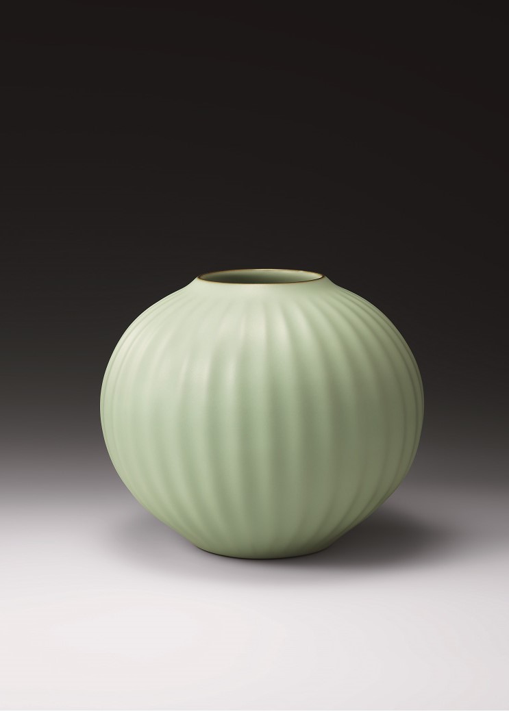 器体の表面を土が柔らかな間にヘラで丁寧に鎬(しのぎ)を入れた作品。釉薬の厚さが器体の凹凸によって異なり、美しい表情を魅せます