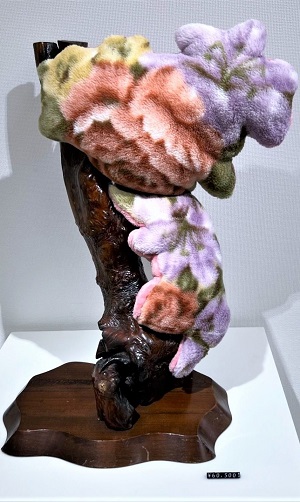 2020年ころから作り続けているシリーズ。当時、毛布の花柄を切り取って物に張り込む行為が剥製を作っている行為に似てると思い、そこから毛布に描かれたお花(装飾の皮)だけを切り取り、縫って、綿を詰め、剥製みたいに艶々の木に無理矢理固定して飾るという一連の流れをやった作品。左はコアラ、右はカニに似てるかなと思ってます(結果論)